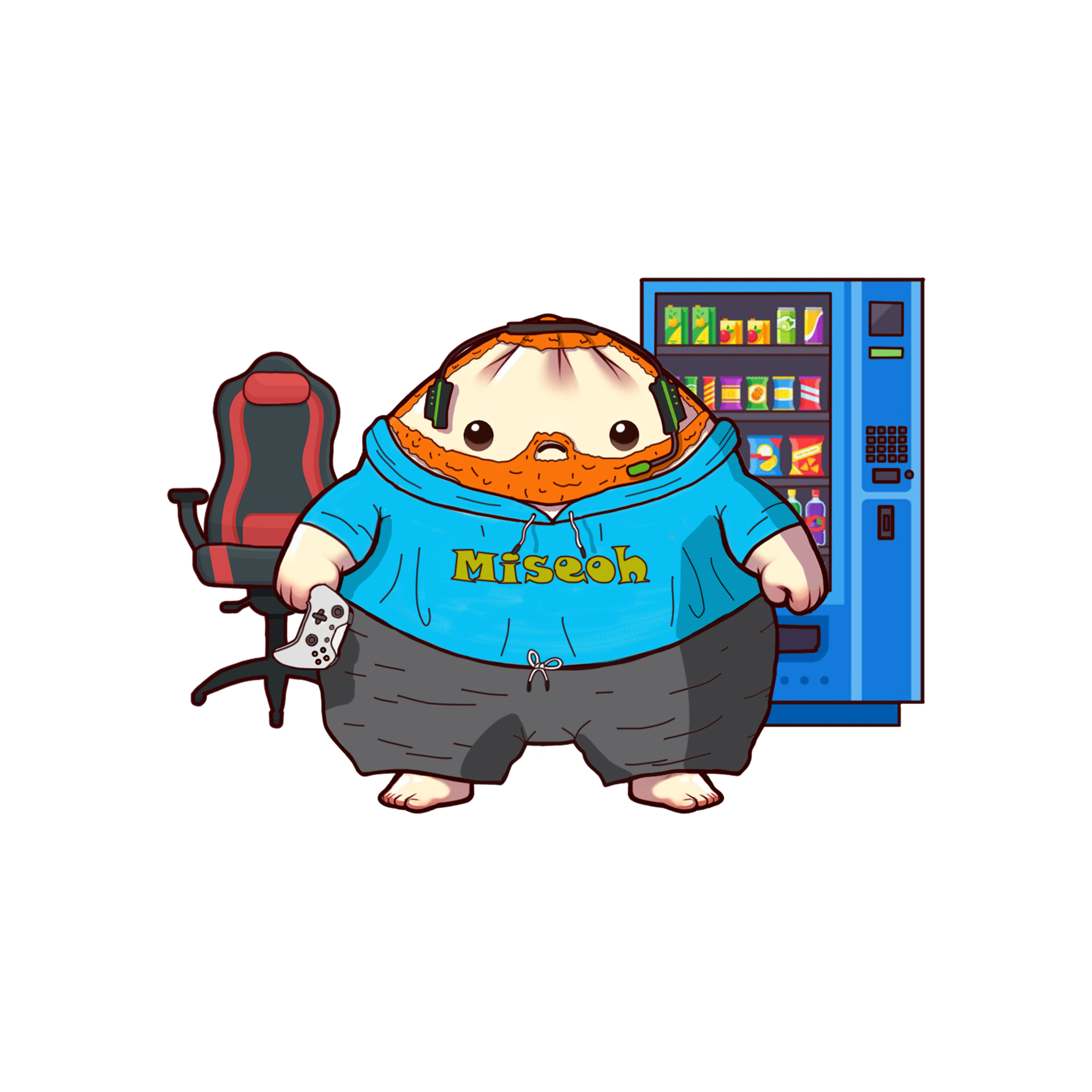 MiseOh is Dumplingville’s top gamer, renowned for his size, weight, and unmatched dedication to his craft. Before he became a gaming icon, life wasn’t always smooth rolling. MiseOh was close to enlisting in the Dumpling Defense Forces, but his dreams were derailed by tough circumstances. he hit a low point when his card was declined at Dumpling Dollar Deals while trying to buy essentials. Now, MiseOh dominates the gaming scene with a massive loyal following who tune in for his live streams and tournaments. Always prepared for marathon gaming sessions, MiseOh keeps a personal vending machine stocked with snacks, energy drinks, and a few secret goodies he claims “boost concentration.”